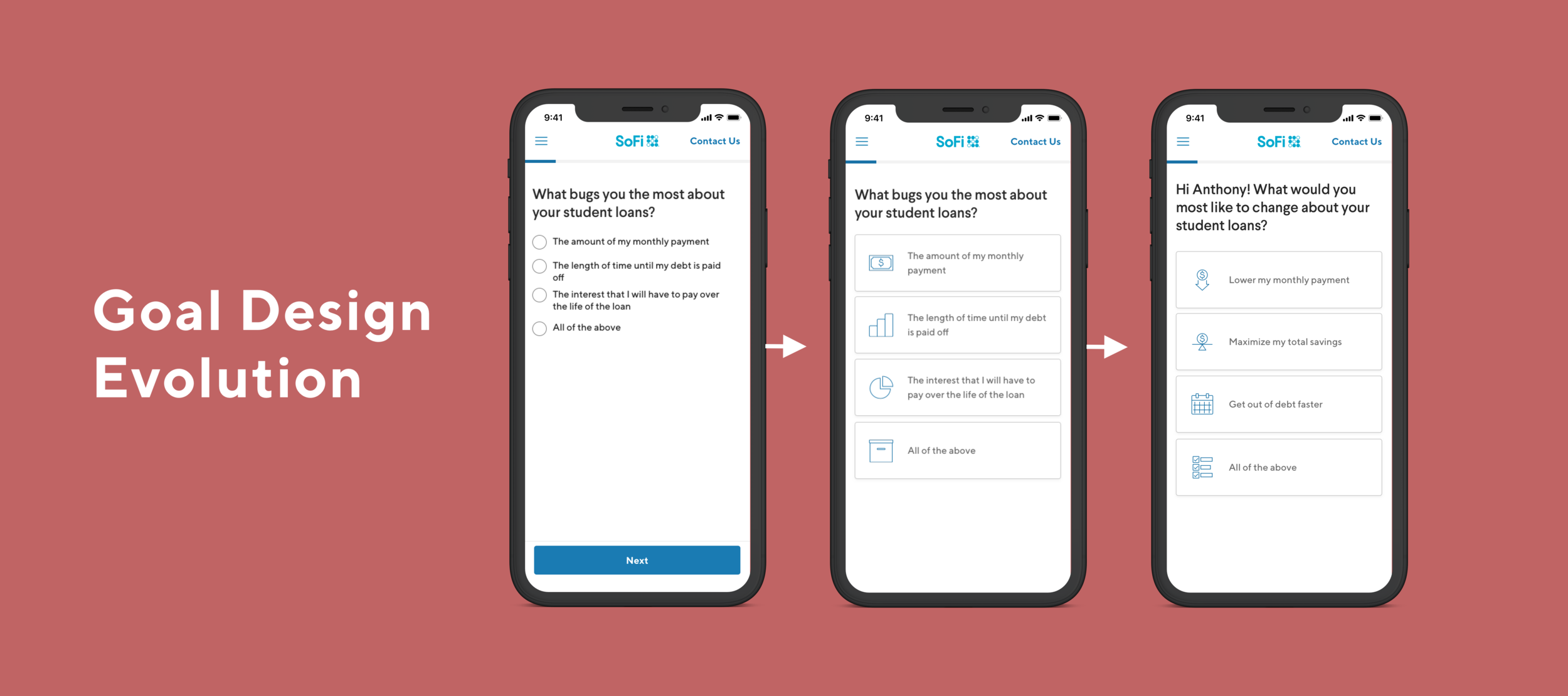 To create the goal options, I referenced existing research including global SoFi segments, Student Loan Refinancing Personas, and Student Loan Refinance customer segments to inform the options offered. I worked with our Content Strategist to refine these options. I also worked with the Design Systems team to create new icons to represent these options.