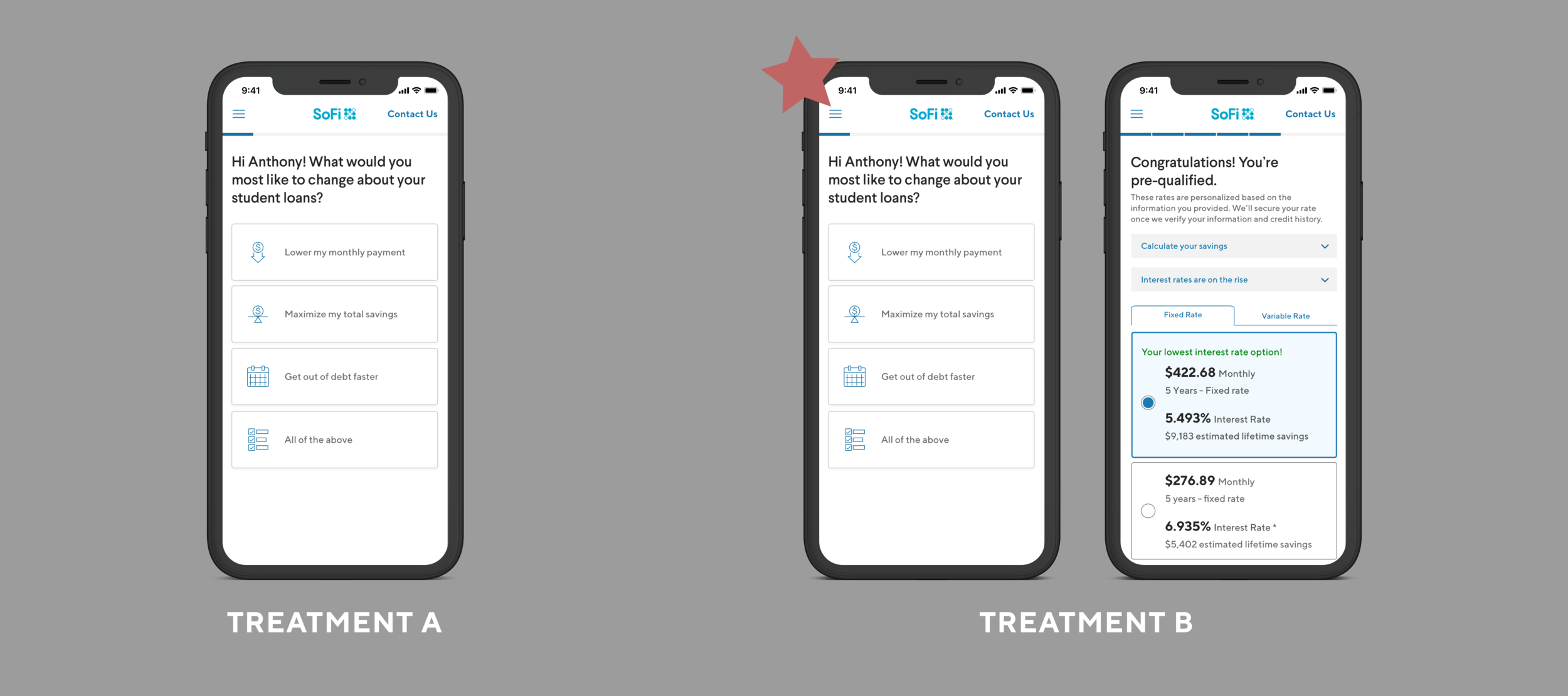 This project summarizes three iterations of the same experiment theme, customization, resulting in 13.8% conversion improvement for the Student Loan Refinancing product at SoFi. The insights driving this experiment were from existing qualitative and quantitative research and drop-off data. We had recently released a new version of our flow, eliminating tech debt and allowing us to begin experimenting and creating custom flows and experiences for different cohorts.
